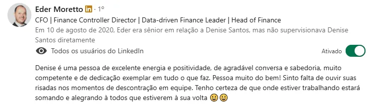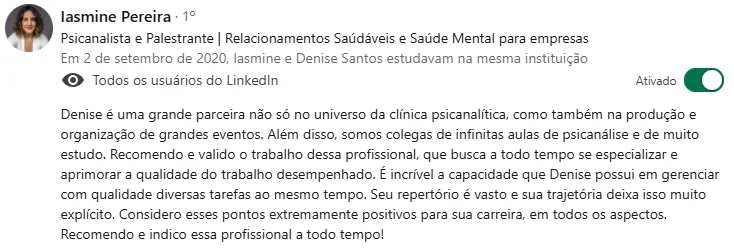 Especialista em Clínica Social Preventiva e Psicodinâmica do Trabalho, Bem Estar Psíquico e Saúde Mental para Empresas e Instituições.